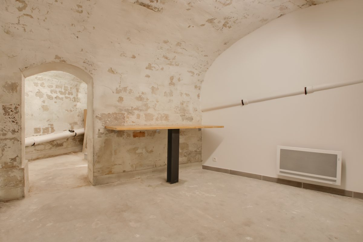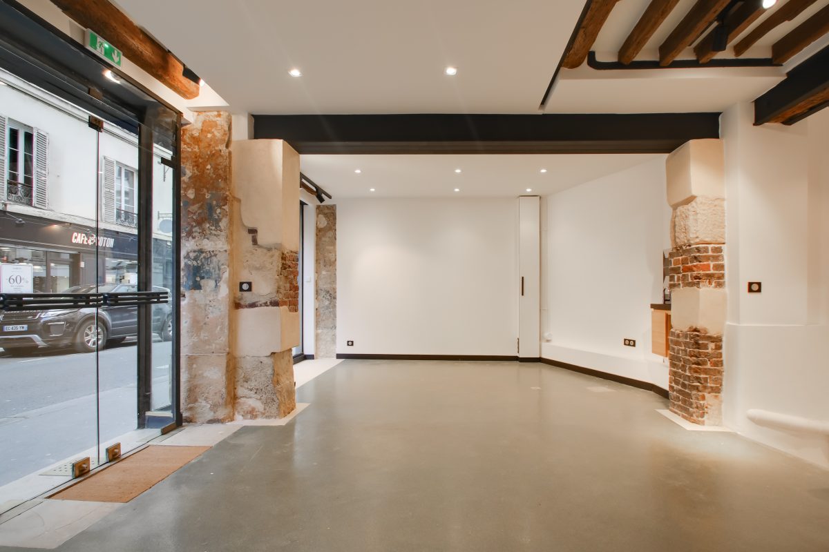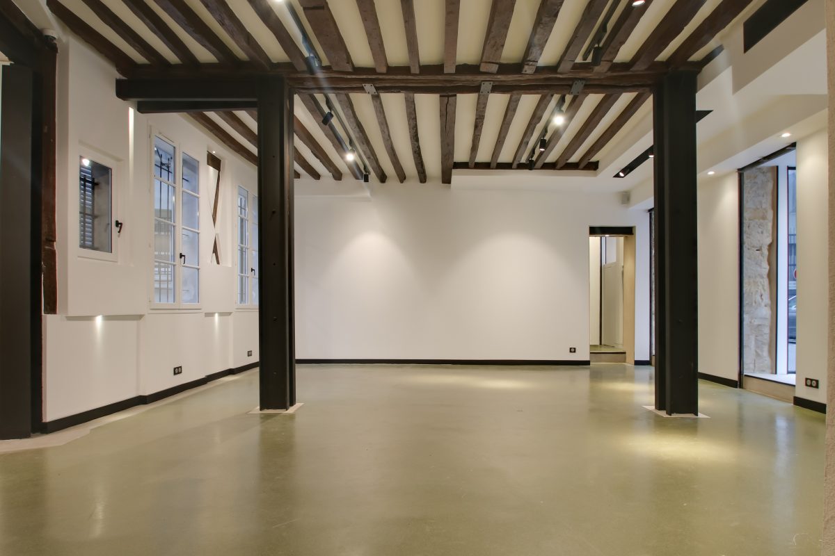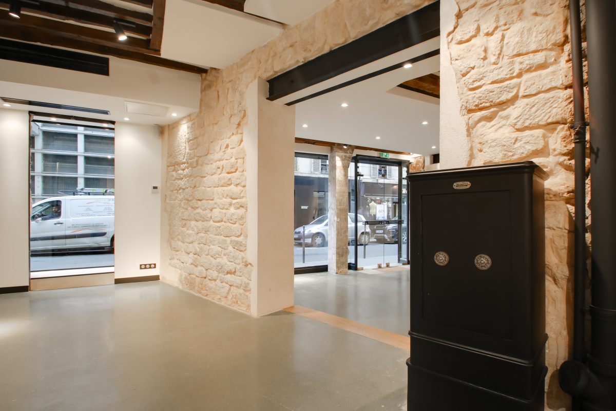 Ouvert sur une cour intérieure arborée typique du Marais, l’espace profite d’un environnement calme et lumineux, rare dans ce quartier animé. Une zone de stockage ainsi qu’un bureau indépendant complètent l’ensemble, permettant une organisation optimale pour les équipes et les opérations.